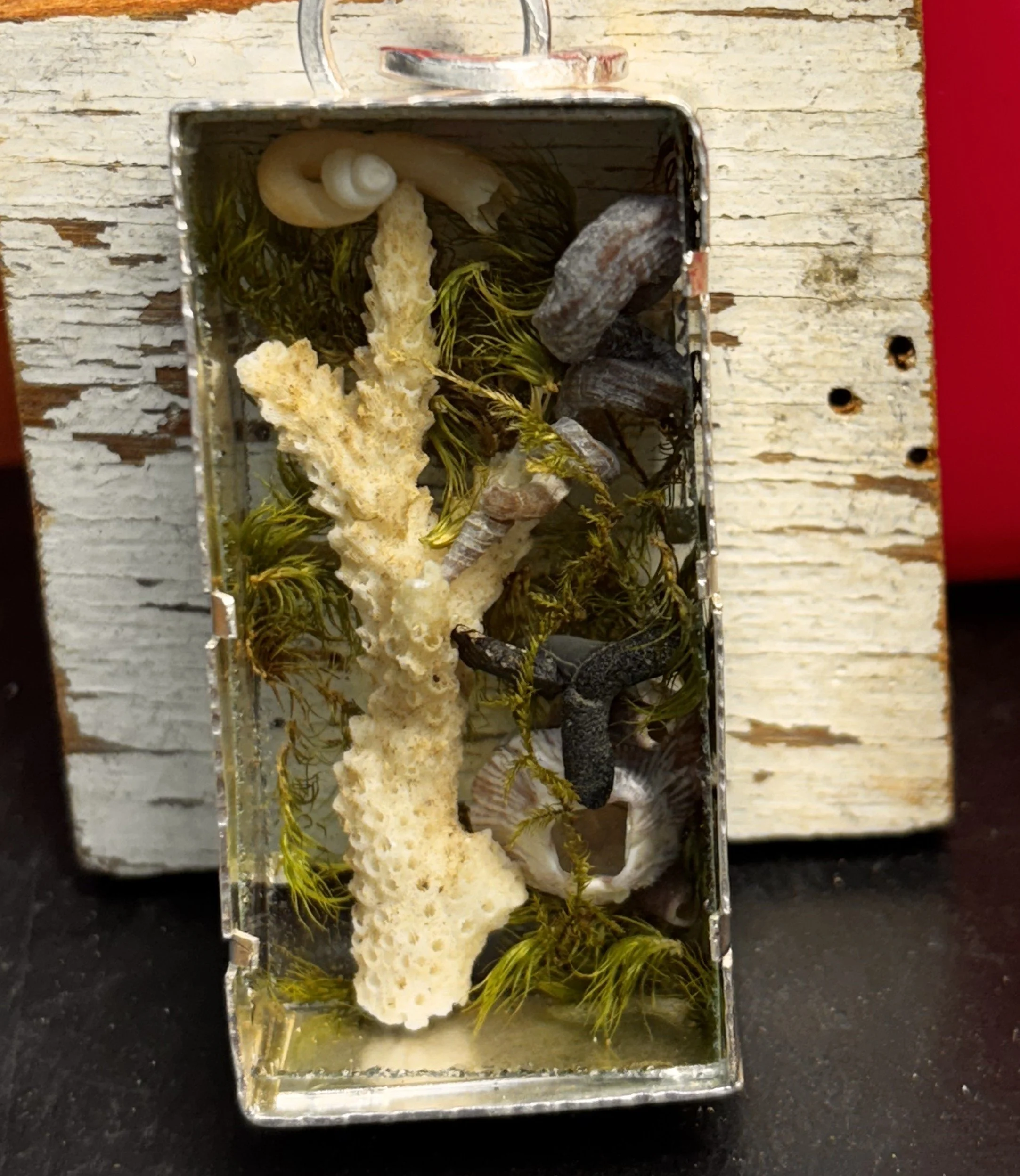 Ocean shadowbox of sterling silver & glass with natural ocean elements