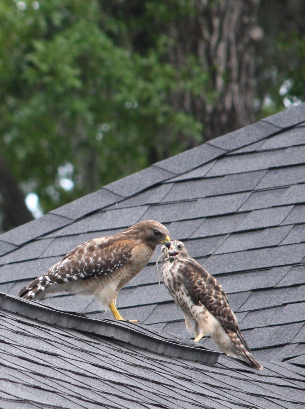 Red-shouldered hawks are common in northeast Florida, but that doesn’t mean they’re always thriving. Several weeks after the baby hawk was brought to a local rehabber, she was ready for release in our front yard. She flew across the street and perched on the neighbor’s roof while calling for her family. Within minutes, her parent found food, flew to her, and fed her.